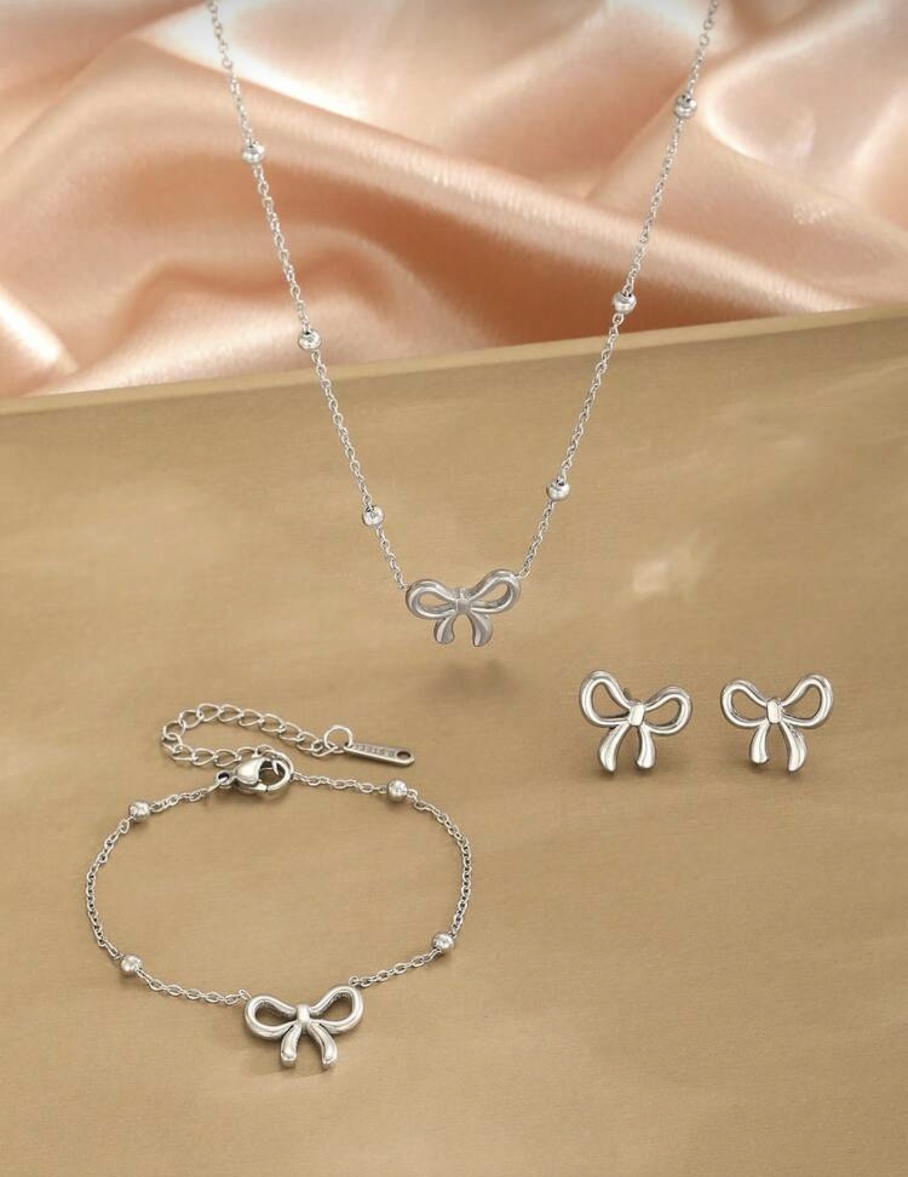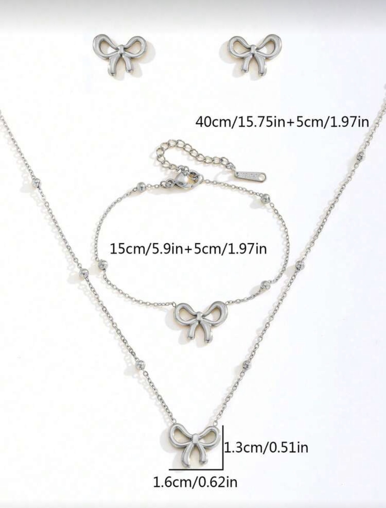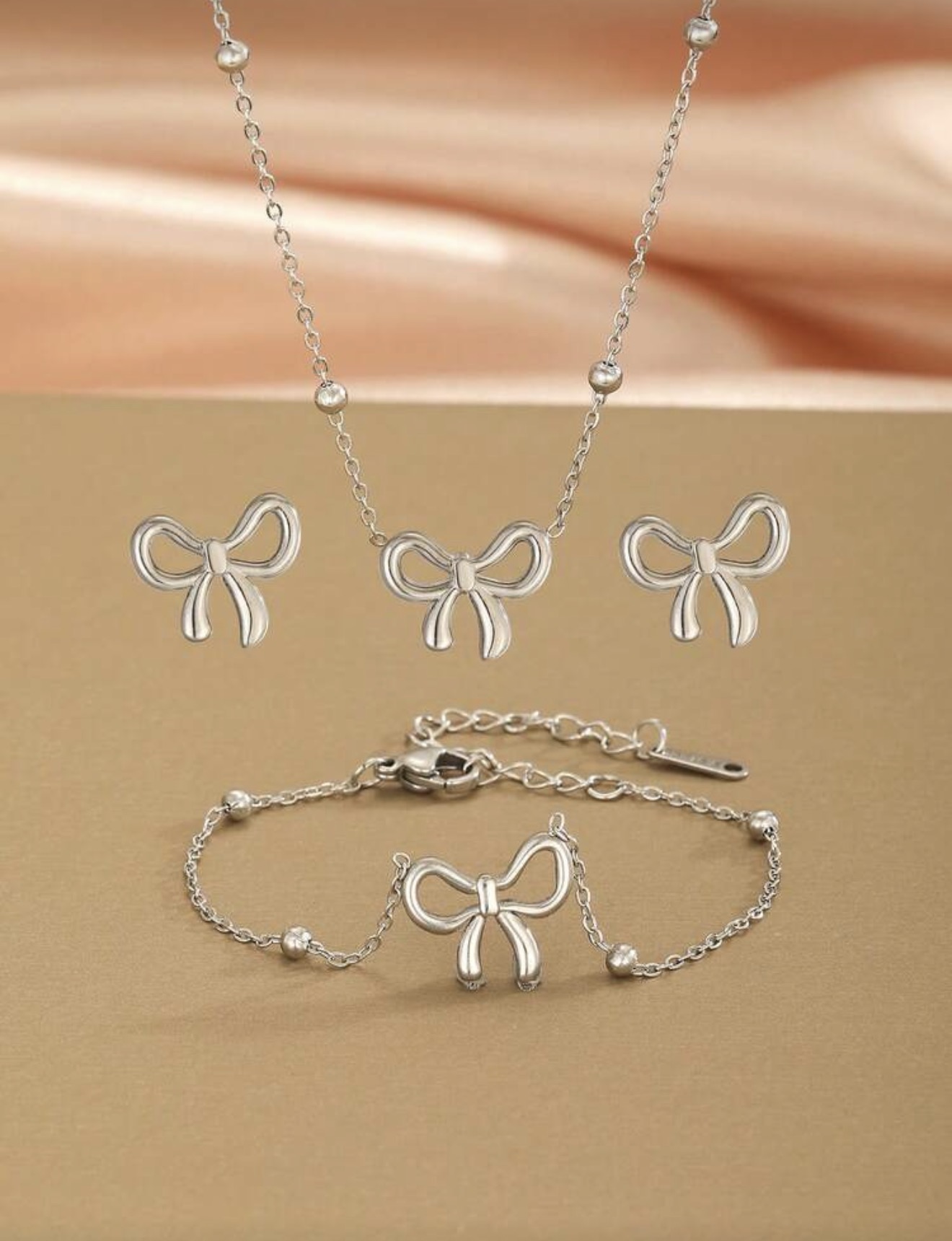 مجموعة مكونة من 3 قطع: قلادة سلسلة فضية من الفولاذ المقاوم للصدأ بتعليقة فراشة، سوار، وأقراط إسفين مناسبة للفتيات كإكسسوار مجوهرات يومي هدية