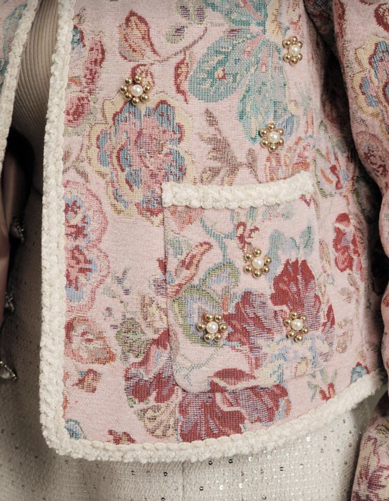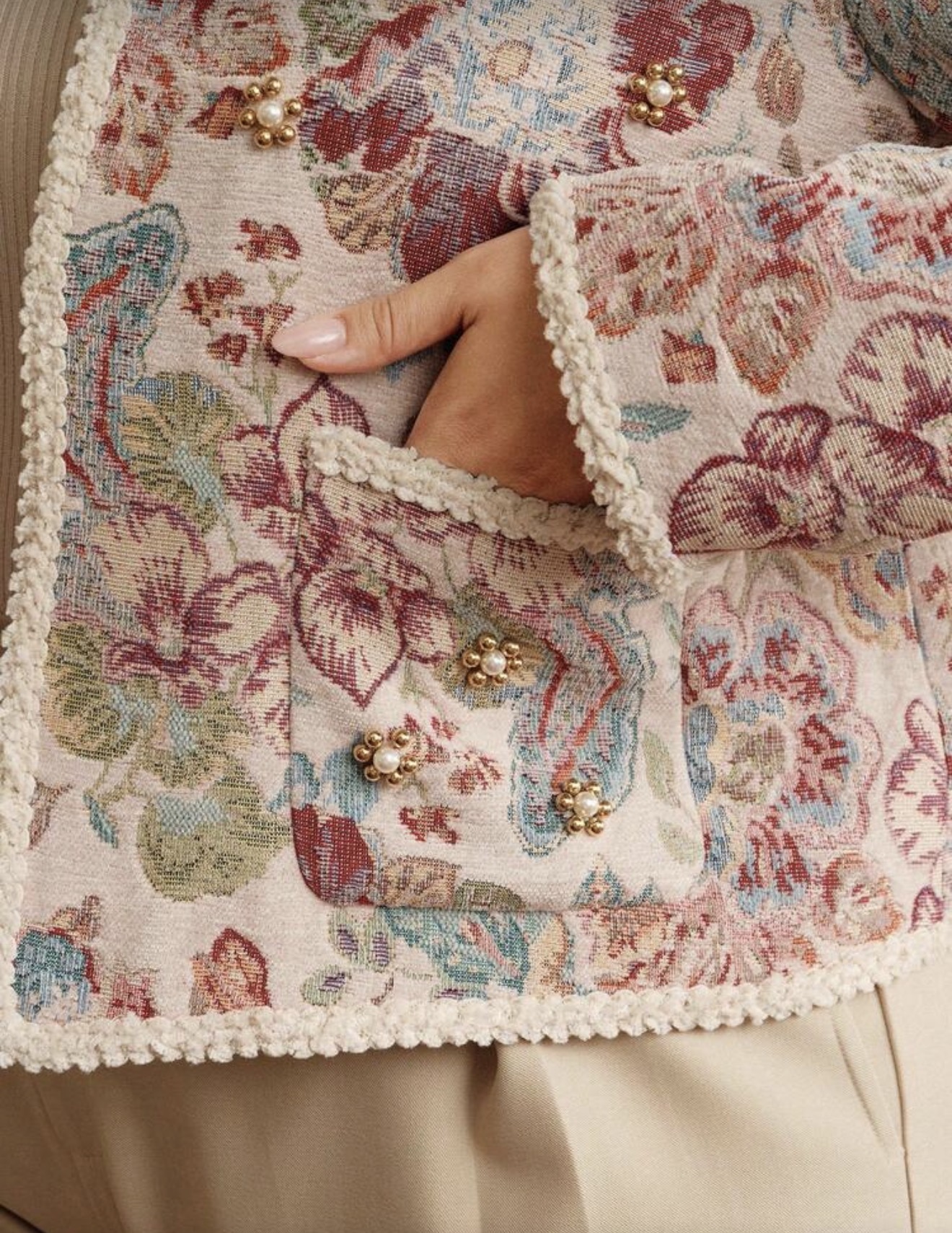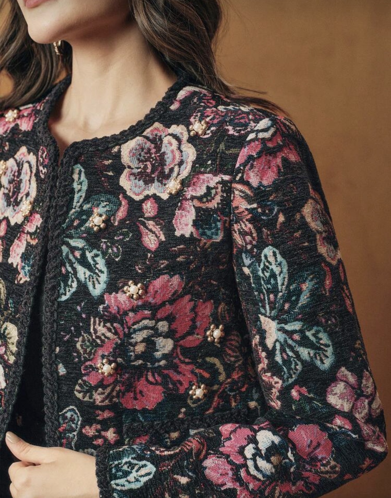 معطف أمامي مفتوح أنيق وعصري، من قماش صوفي مطرز بزخارف زهرية، مزين باللؤلؤ، بتصميم حاشية مضفرة، بأكمام طويلة، للنساء، مناسب للخريف والشتاء