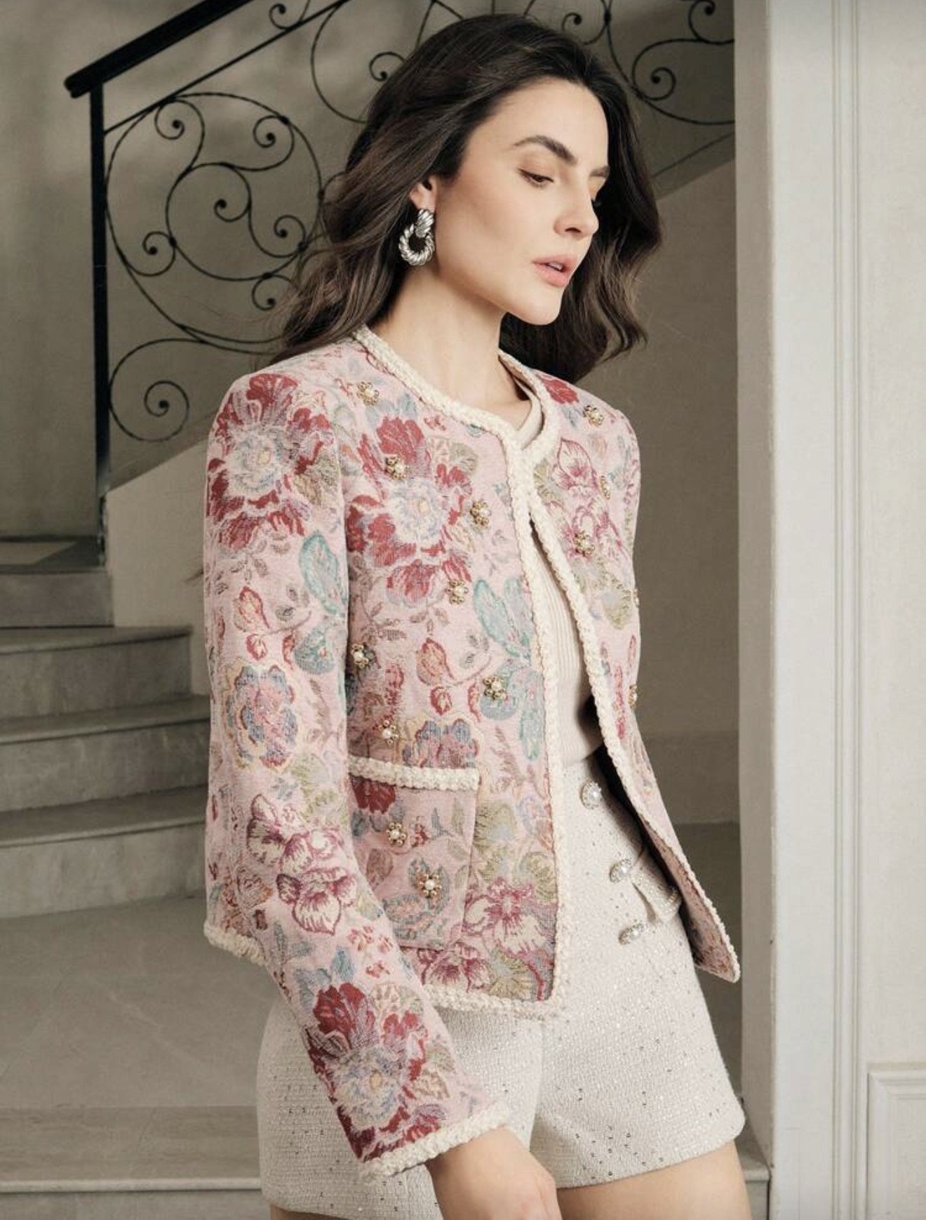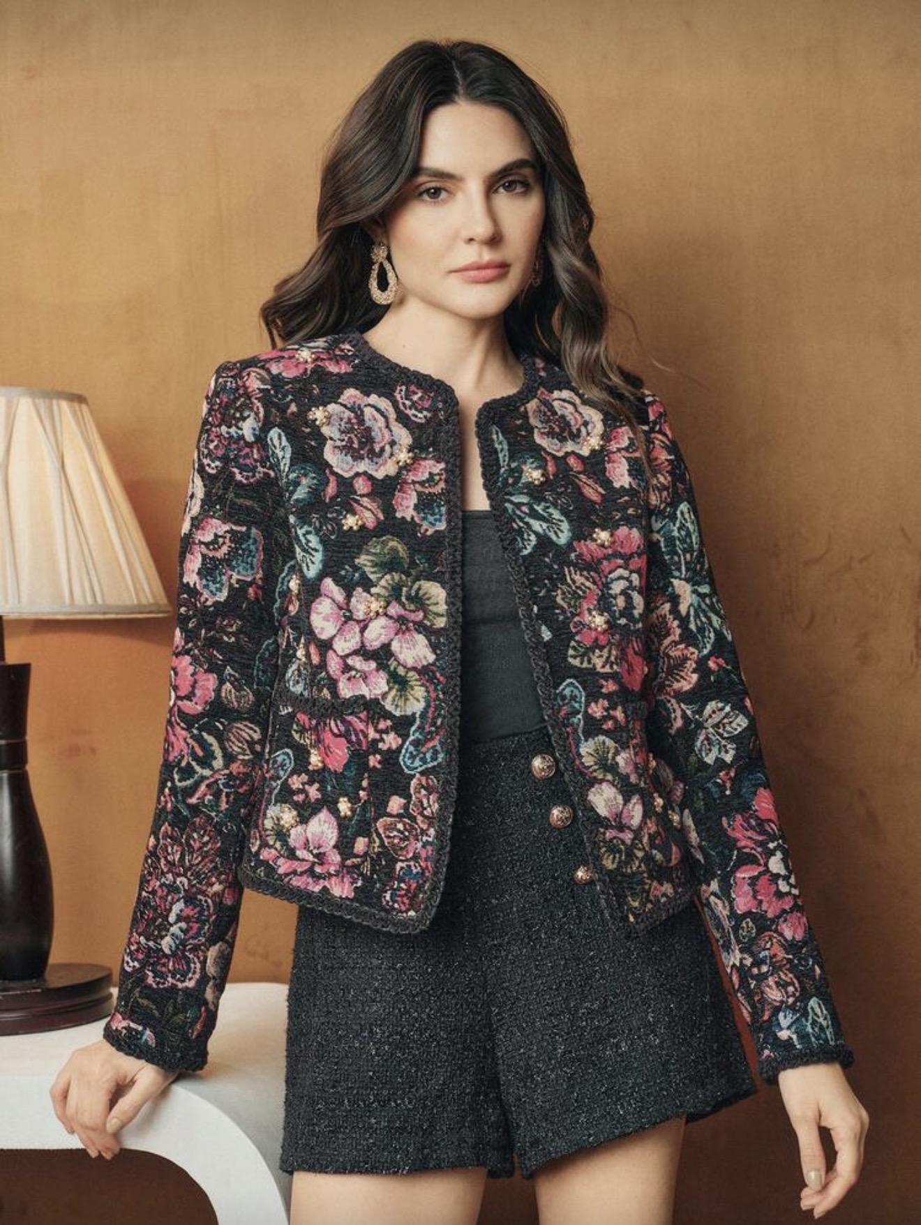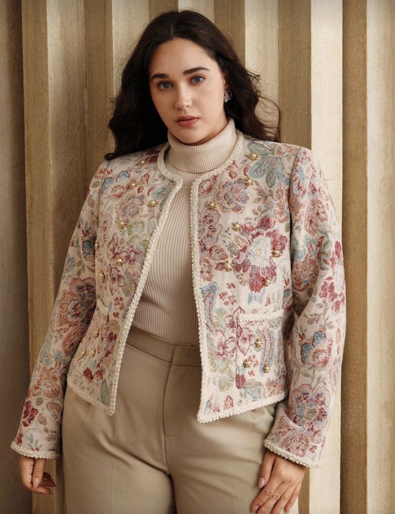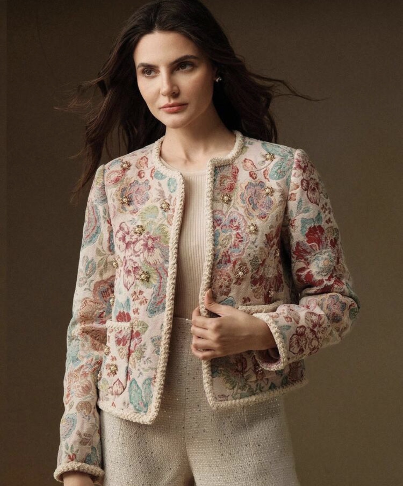 معطف أمامي مفتوح أنيق وعصري، من قماش صوفي مطرز بزخارف زهرية، مزين باللؤلؤ، بتصميم حاشية مضفرة، بأكمام طويلة، للنساء، مناسب للخريف والشتاء