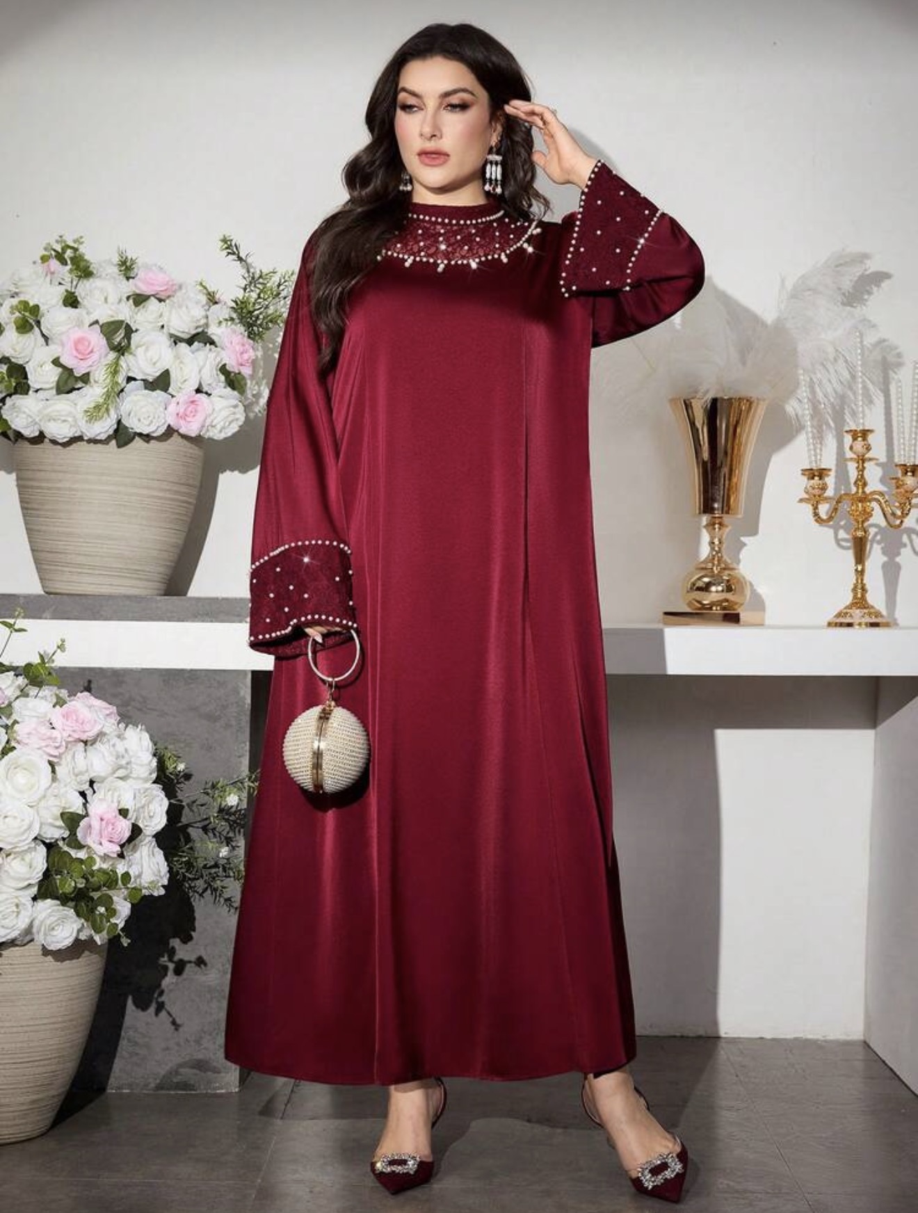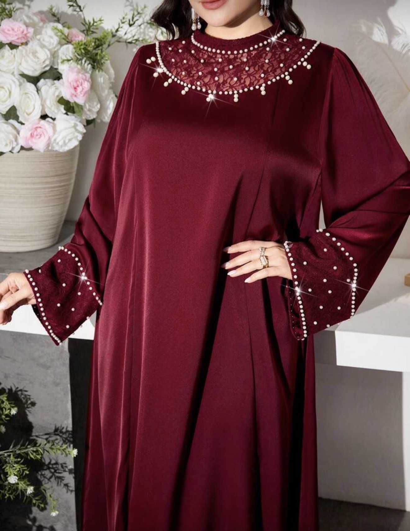 جلابيات قفاطين رمضان فستان أنيق بياقة عالية وتصميم من الدانتيل والأكمام الواسعة، لون بوردو