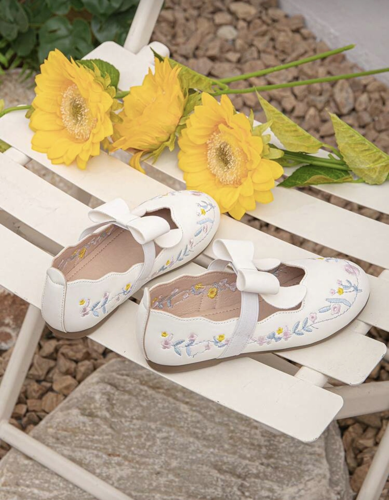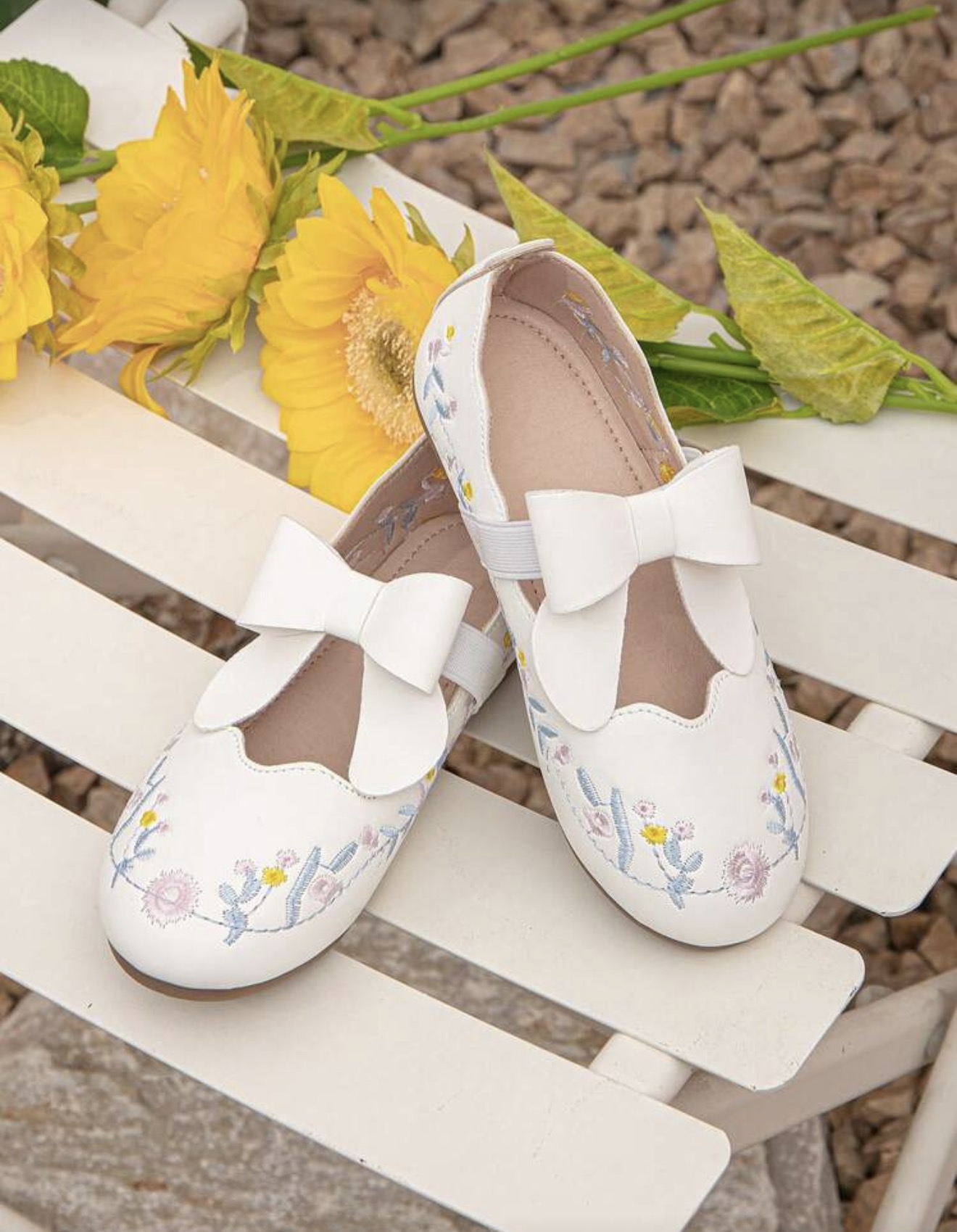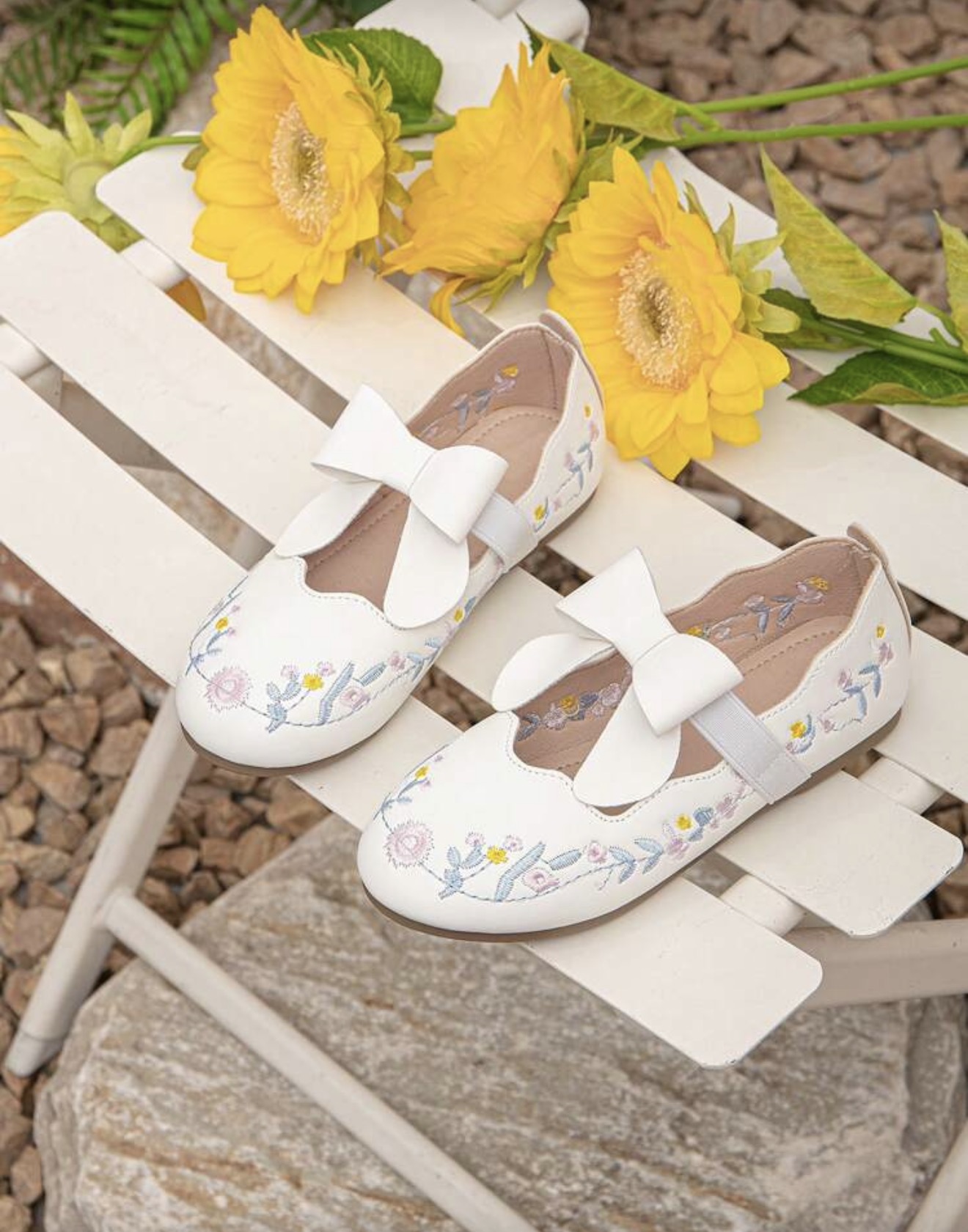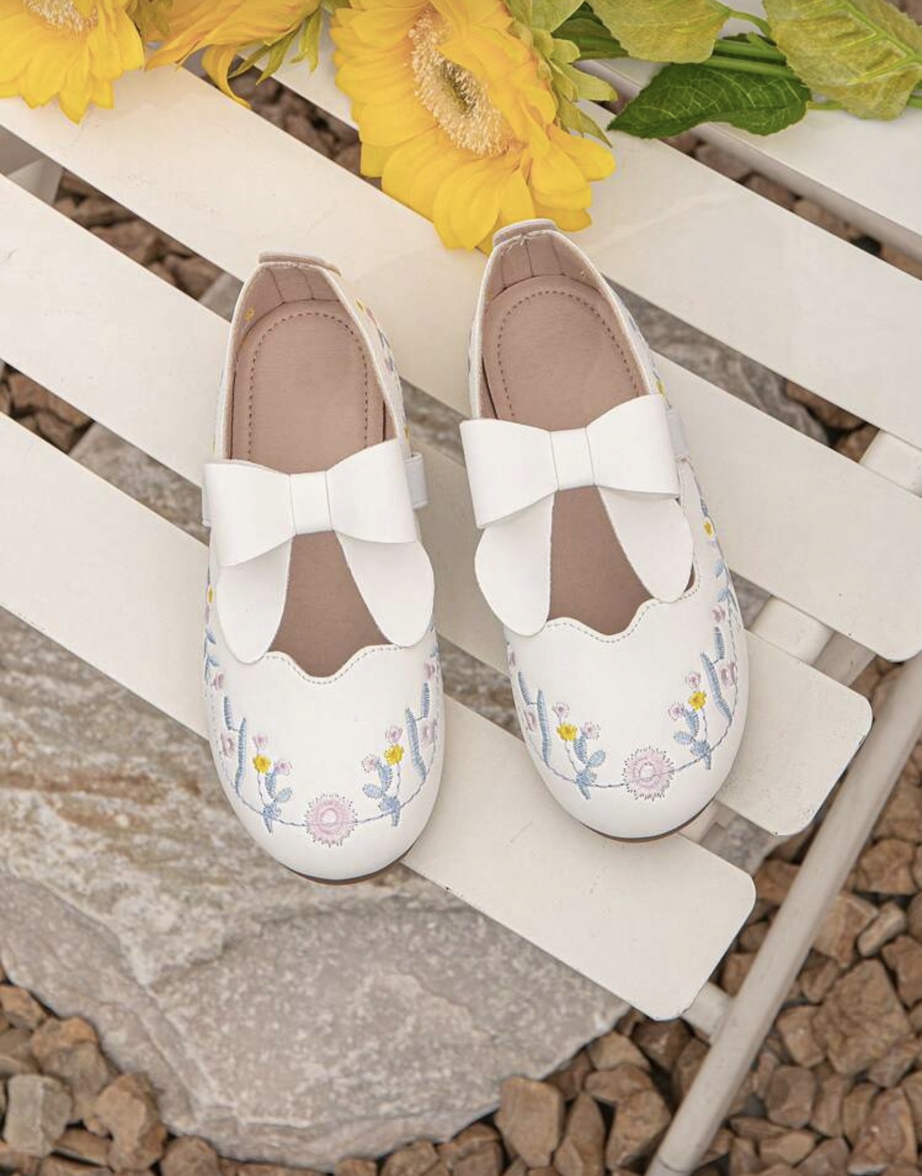 أحذية بنات بيضاء قابلة للانزلاق مع زينة عقدة الحذاء، شقق مطرزة