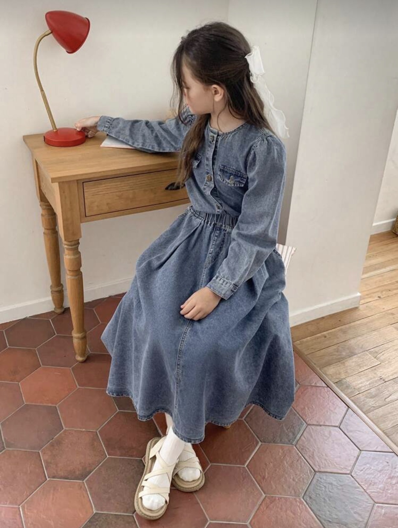 بدلة جينز بياقة مستديرة وأكمام منتفخة طويلة أحادية الصدر للفتيات المراهقات للعيد