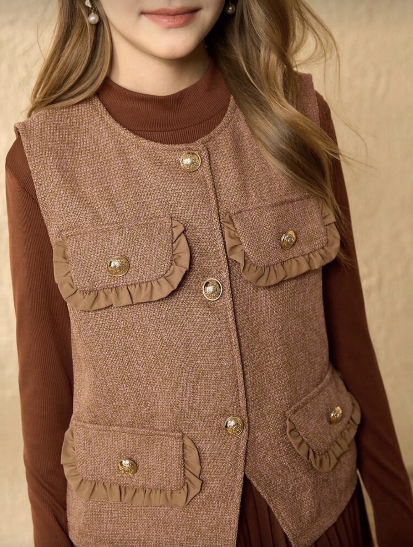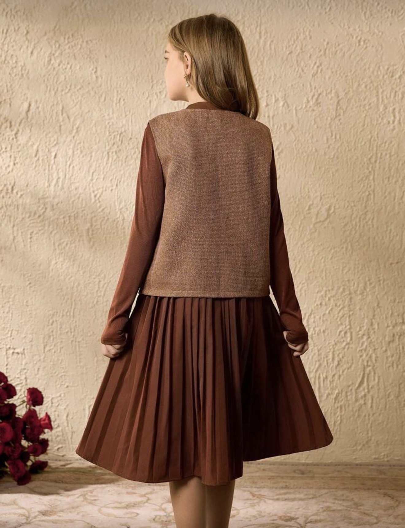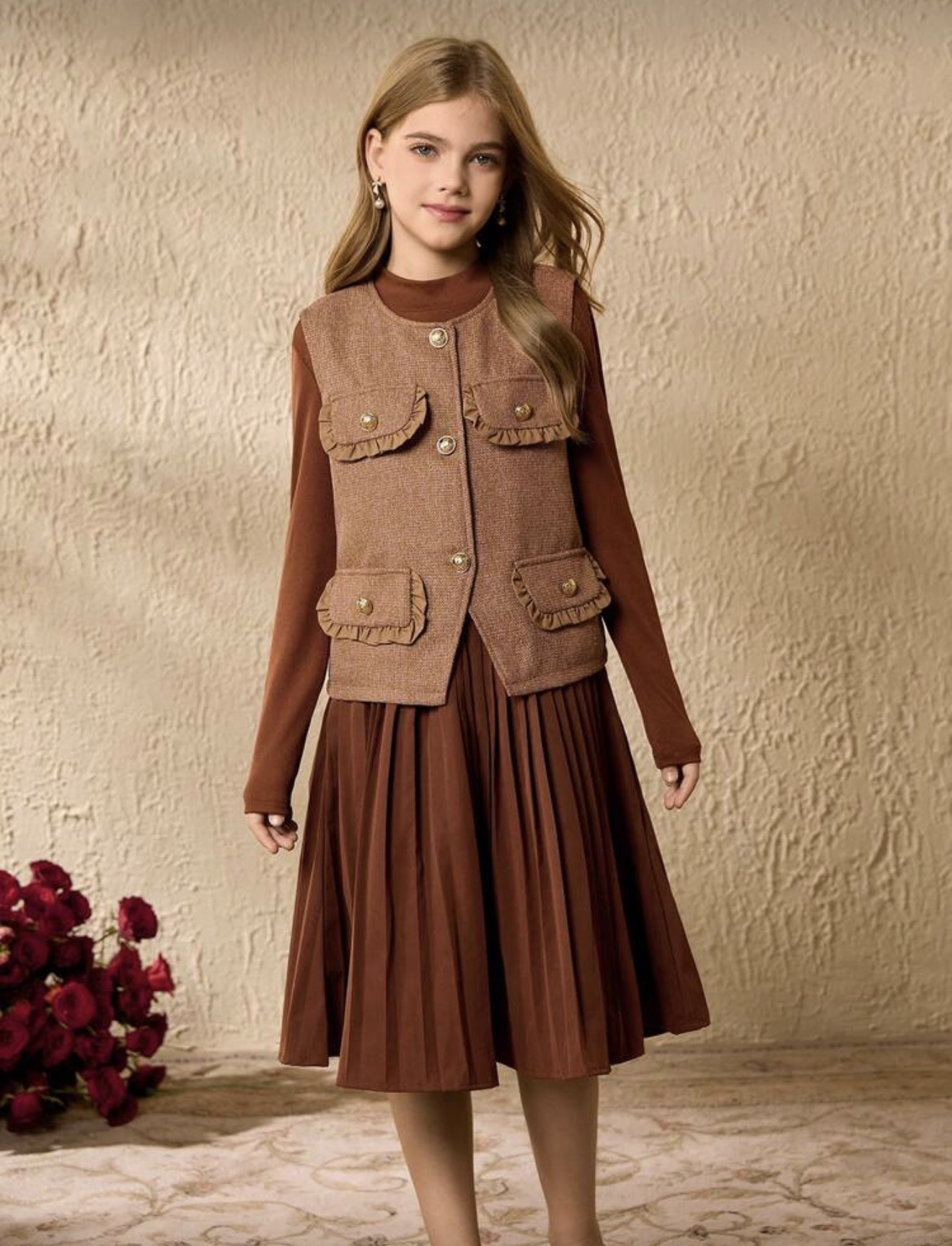 طقم بنات فستان كوري أنيق للفتيات المراهقات، جاكيت بدون أكمام مزينة بالكشكشة والفرو، وفستان بأكمام طويلة