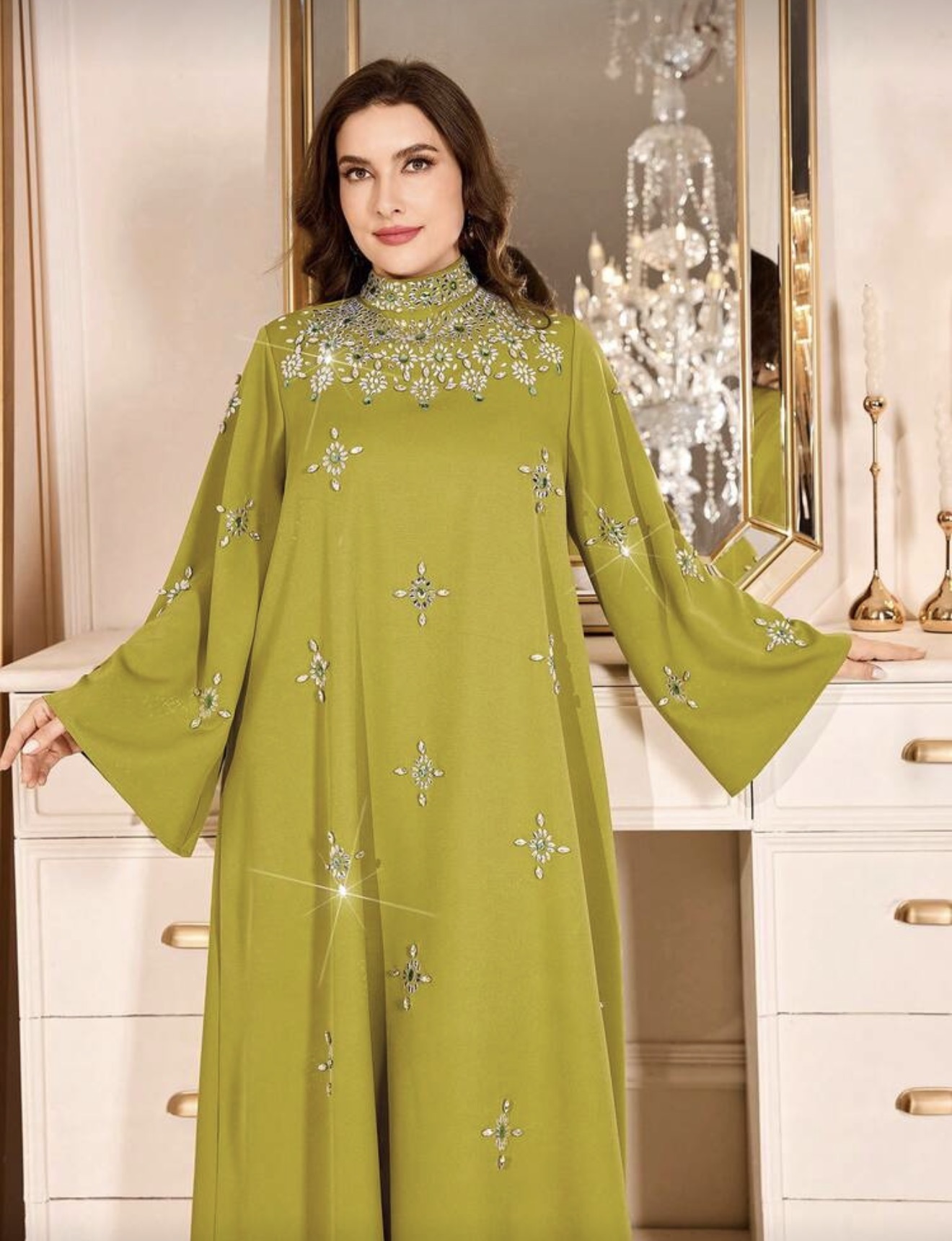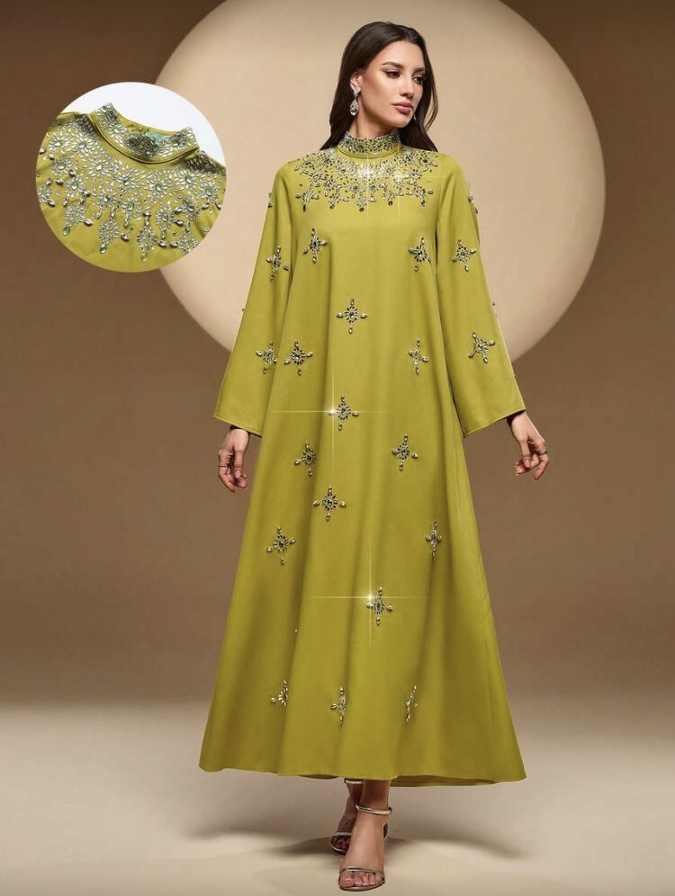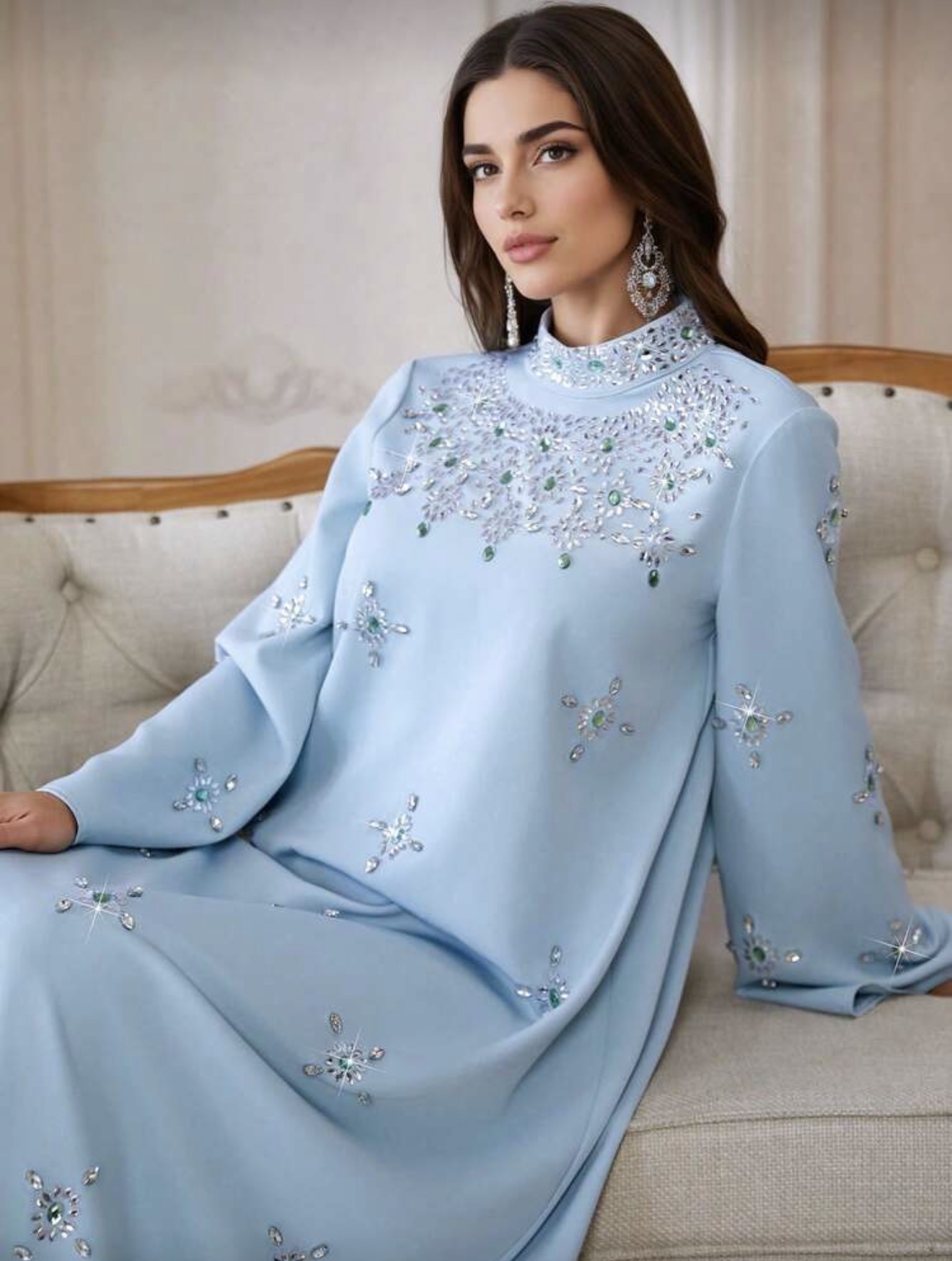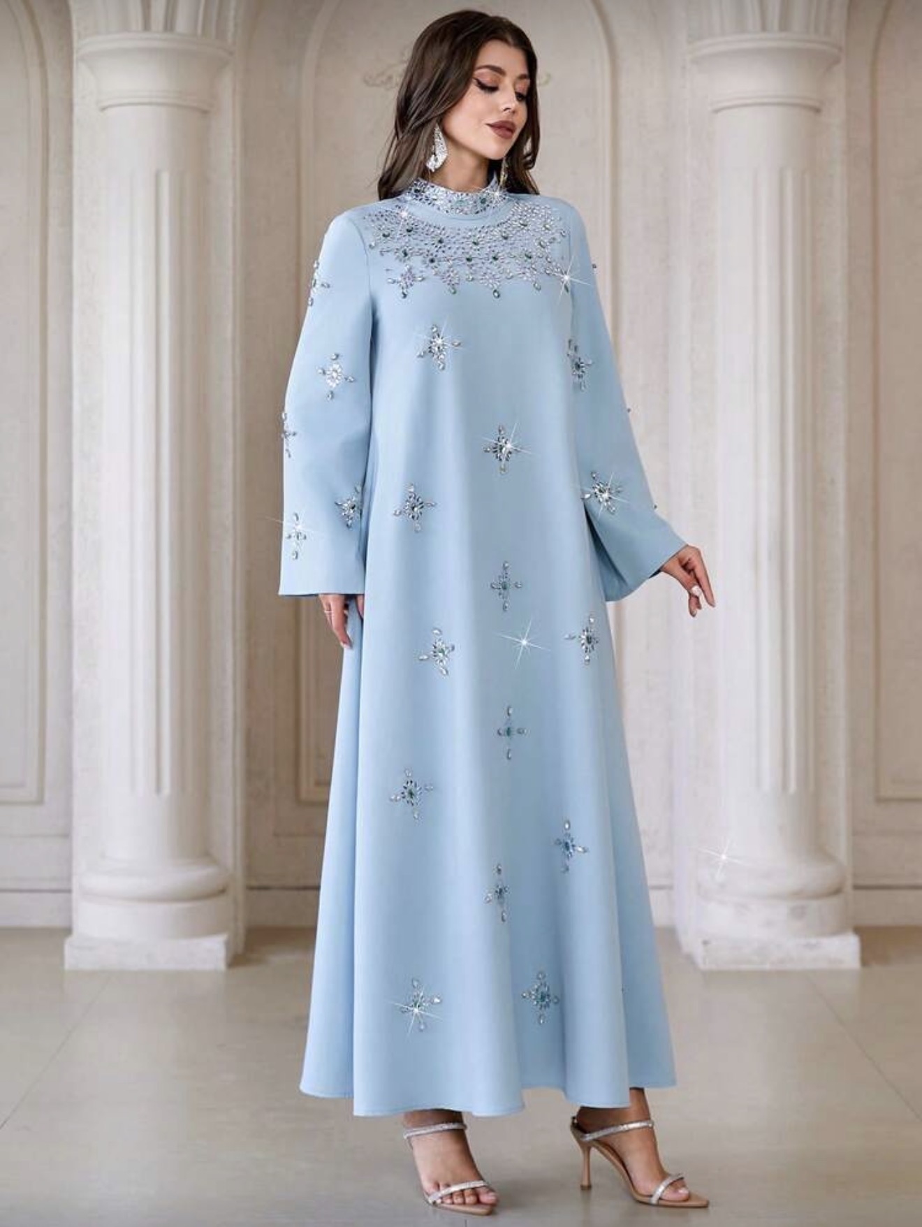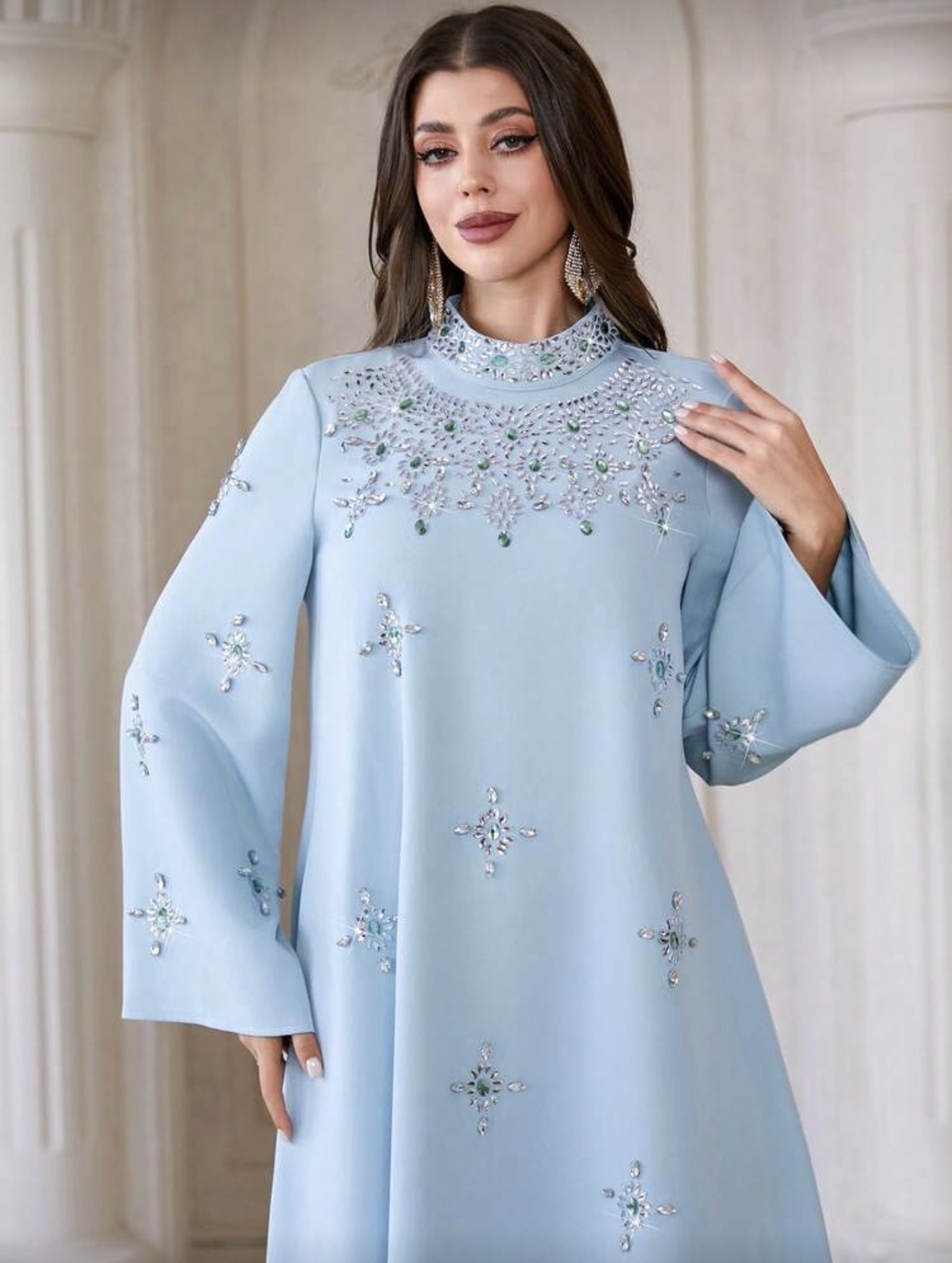 فستان نسائي أنيق بياقة عالية وأكمام طويلة، بتطريز من الراين والخرز واللؤلؤ، مناسب للحفلات والمناسبات والارتداء اليومي