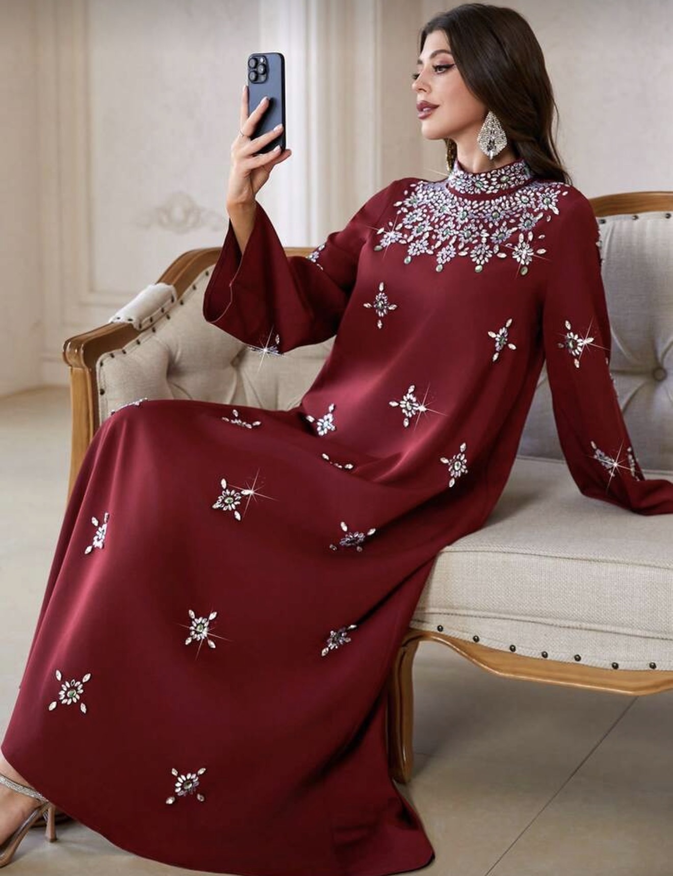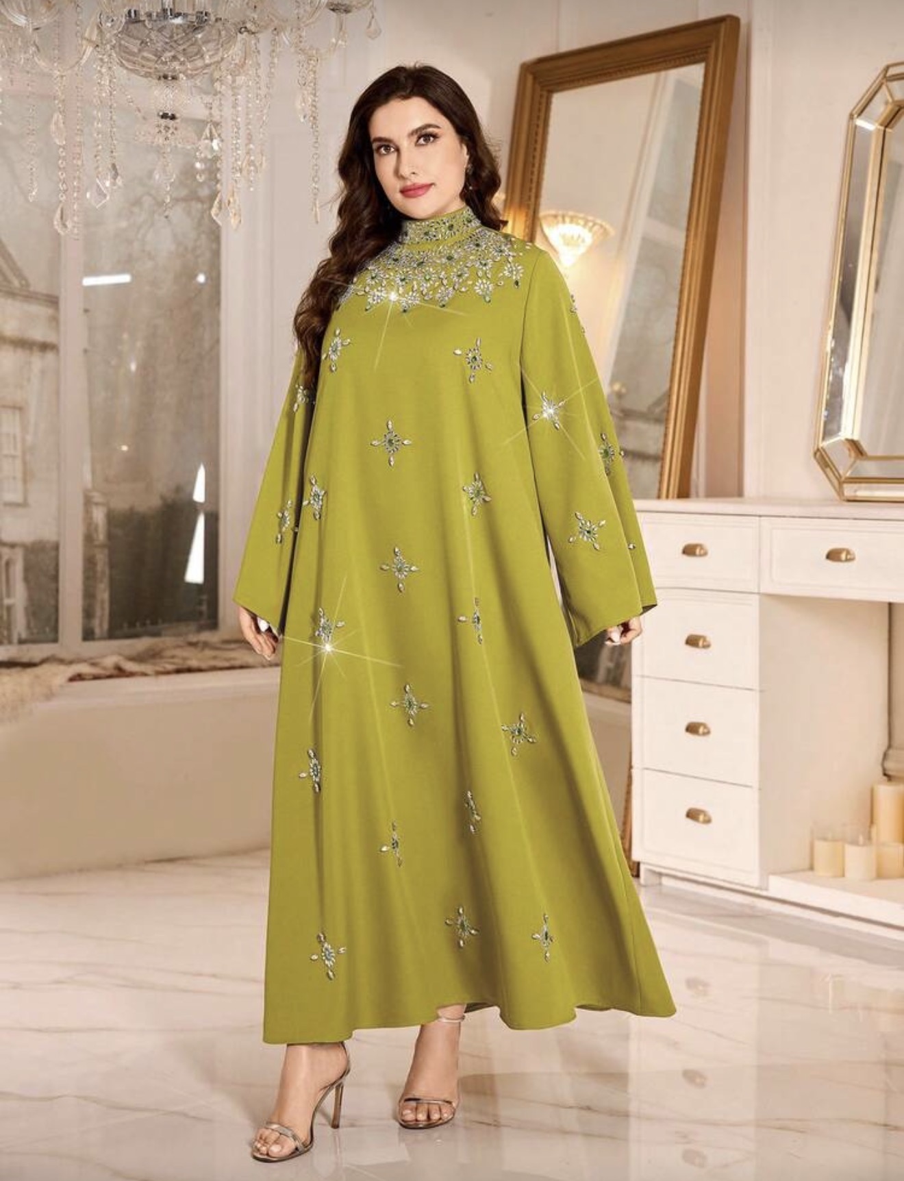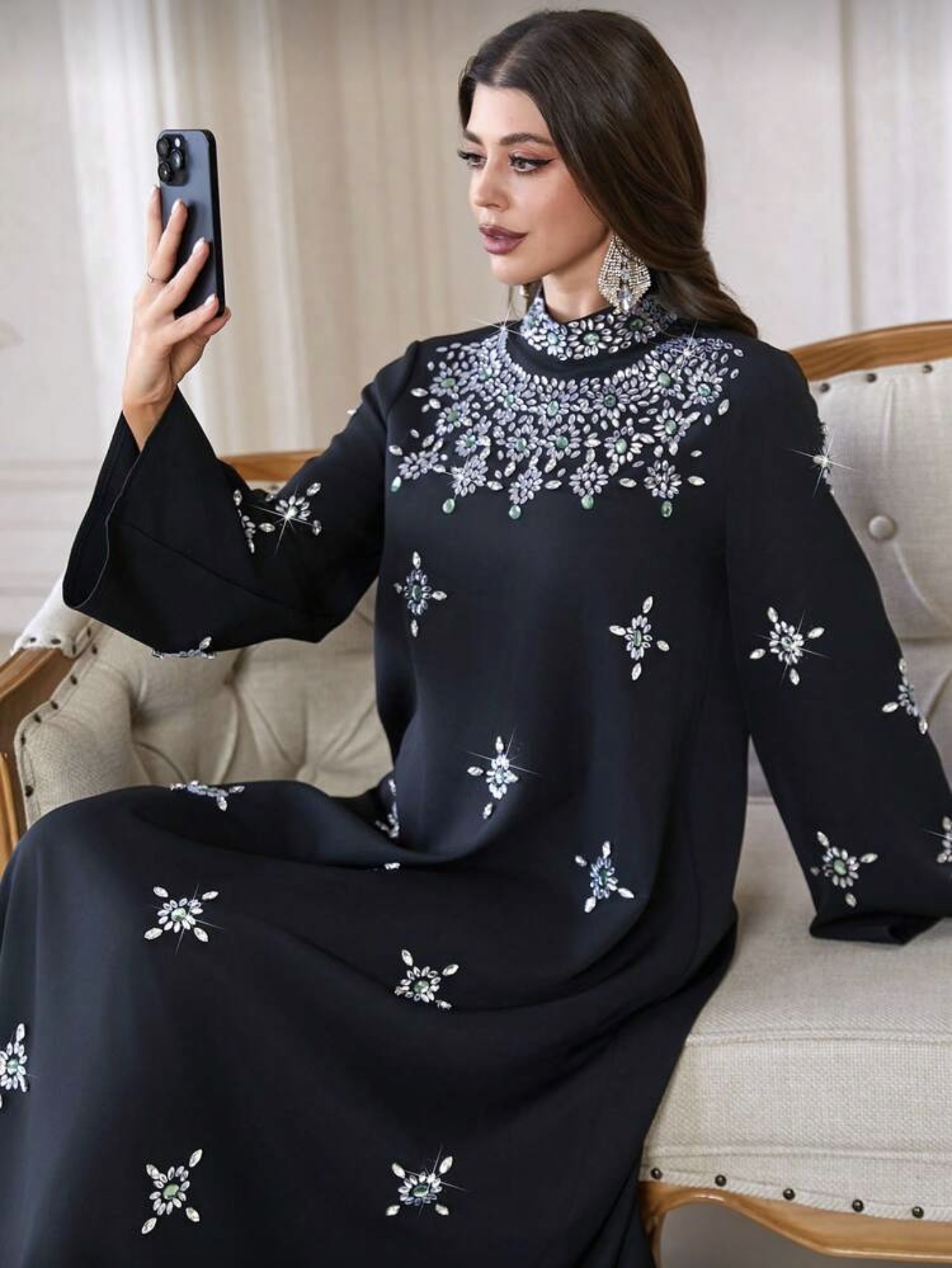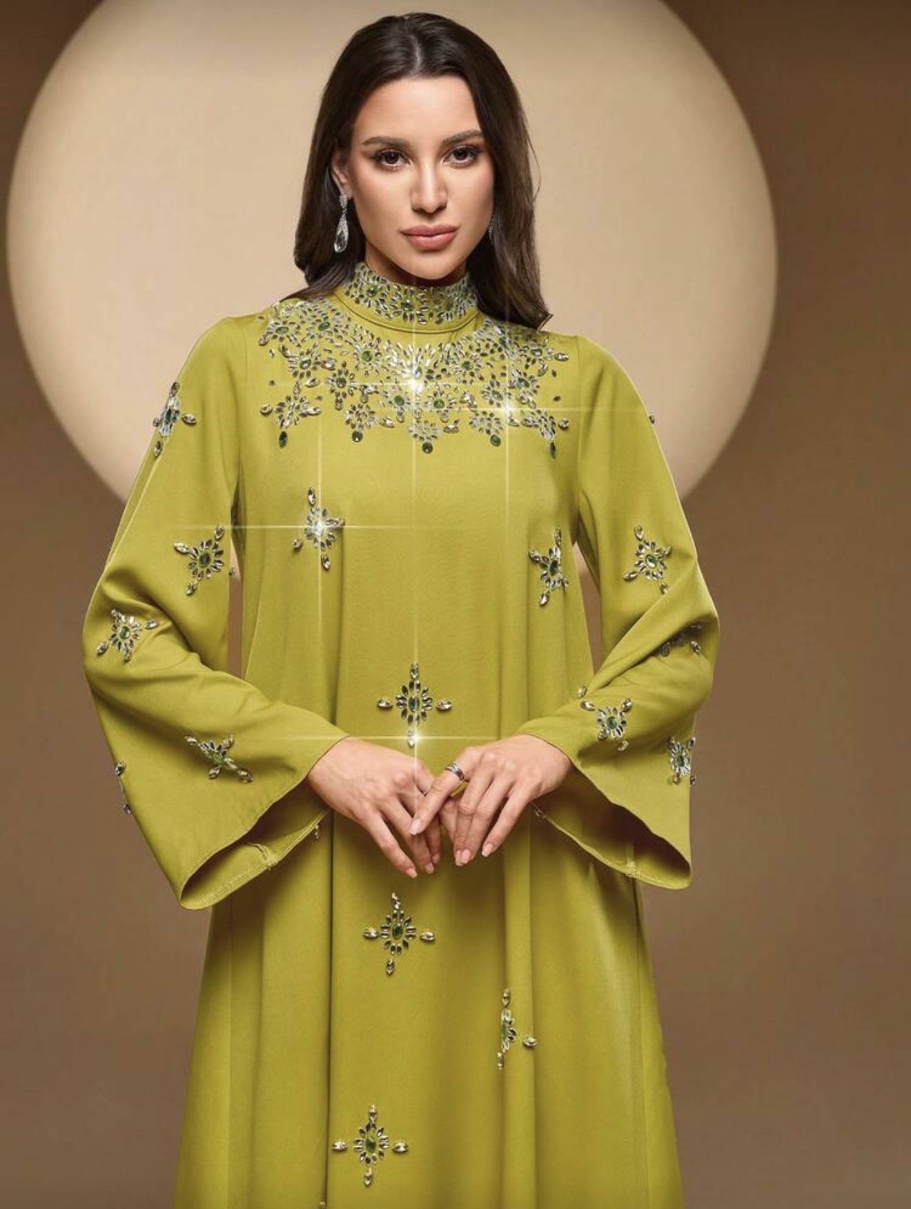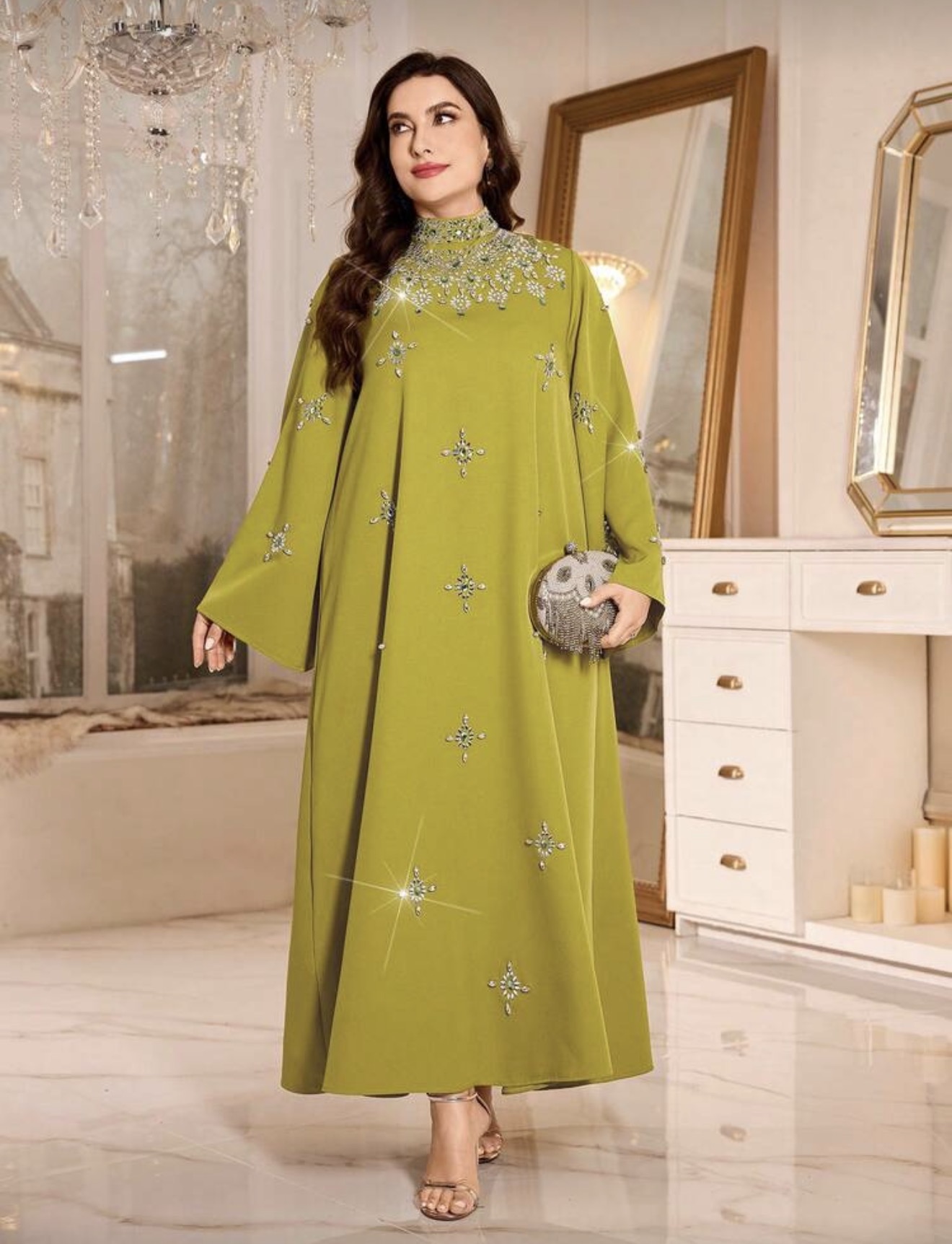 فستان نسائي أنيق بياقة عالية وأكمام طويلة، بتطريز من الراين والخرز واللؤلؤ، مناسب للحفلات والمناسبات والارتداء اليومي