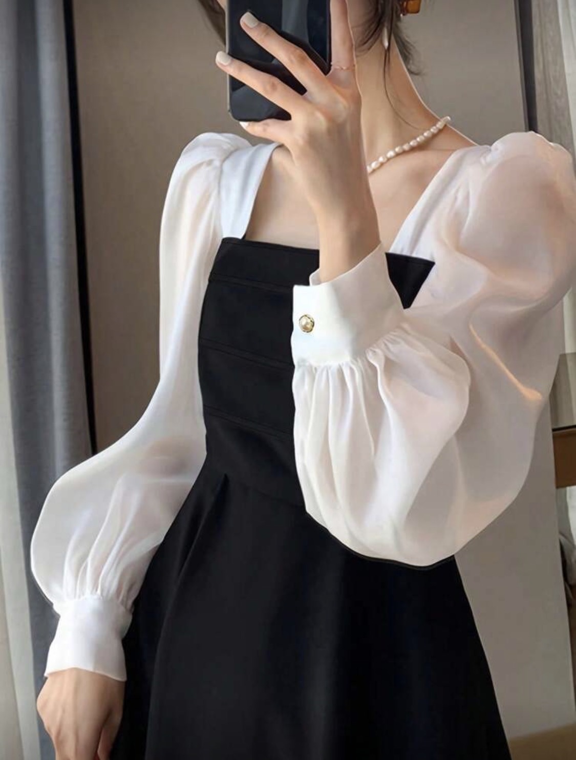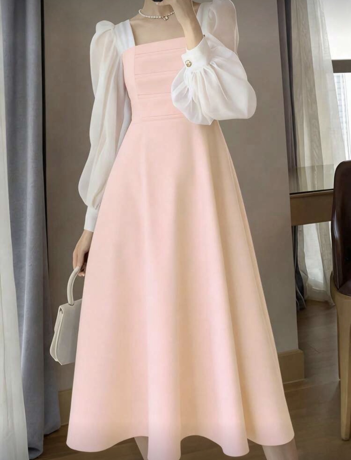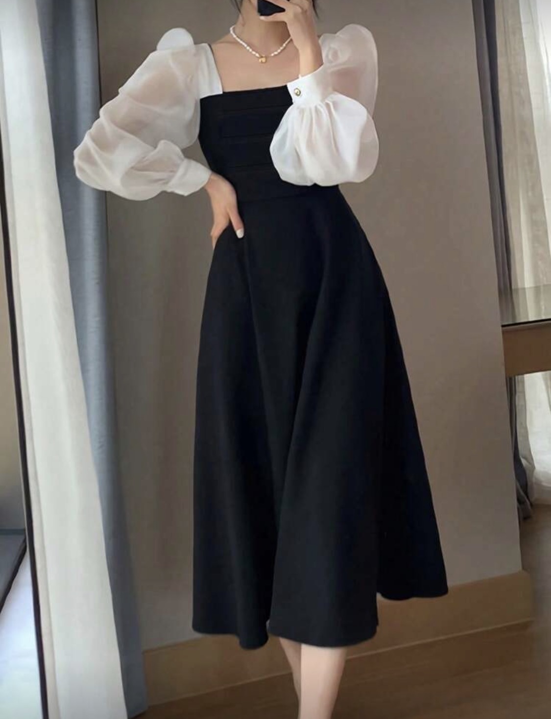 فستان بناتي أسود قصير الأكمام على الكتف بتنورة A مقاس طويل، أكمام منتفخة، رقبة مربعة، قصة فرنسية فاخرة شبه شفافة، مناسب للربيع والصيف والخريف، يصلح للارتداء اليومي والمناسبات الرسمية