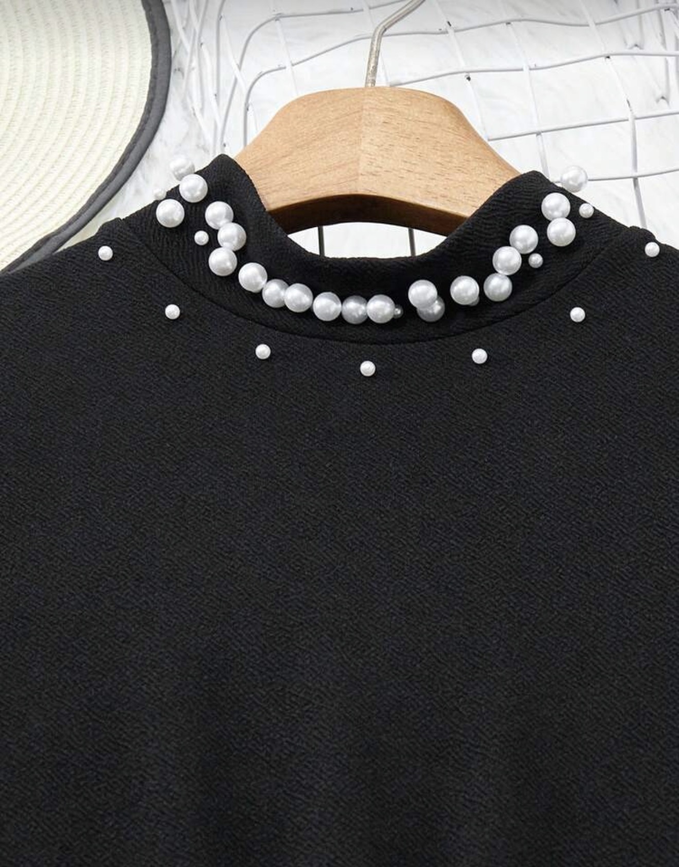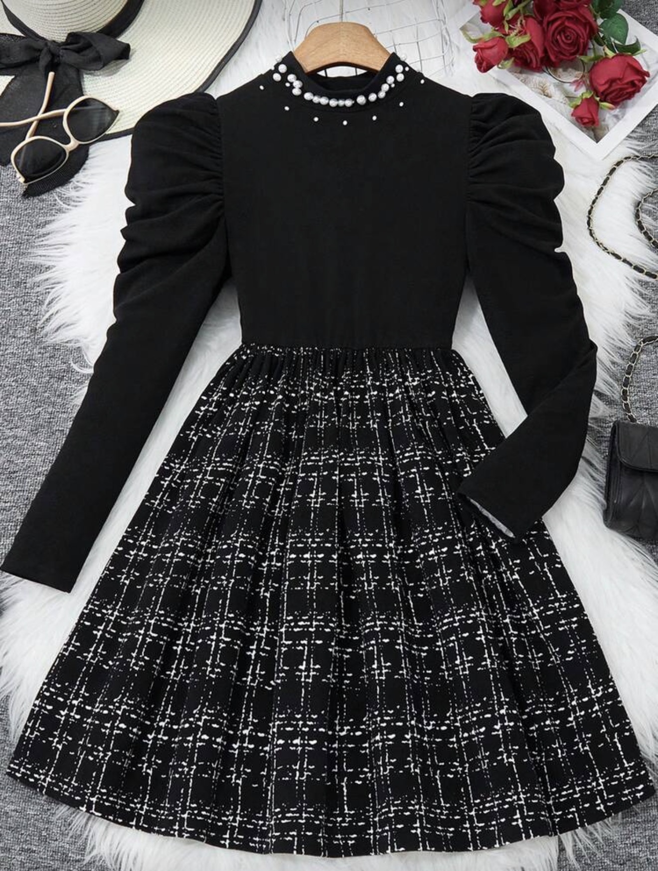 فستان كاجوال مُنسوج أنيق للمراهقات مع ياقة عالية وأكمام منتفخة مزينة بخرز اللؤلؤ الاصطناعي، وحزام خصر، مناسب للخريف والشتاء