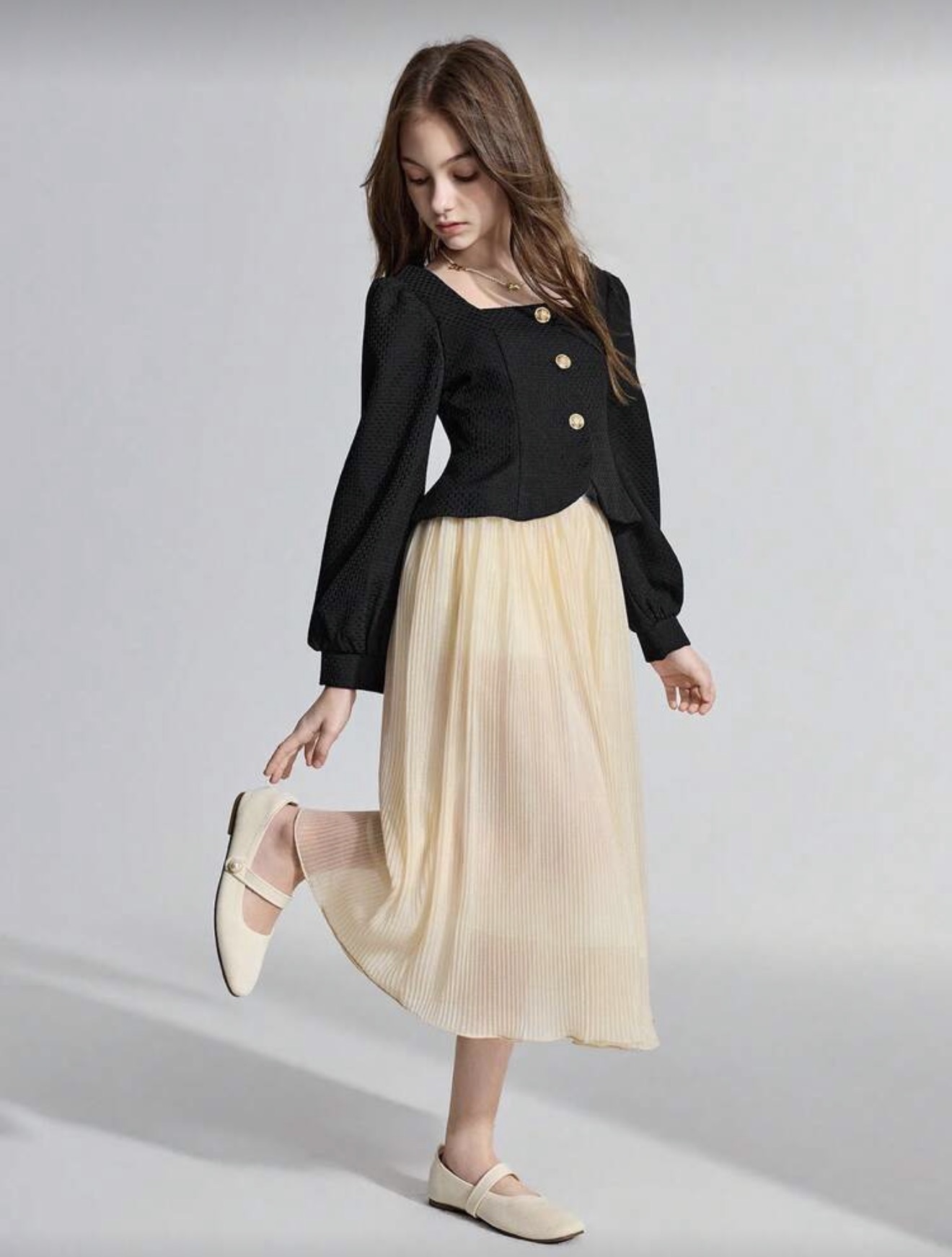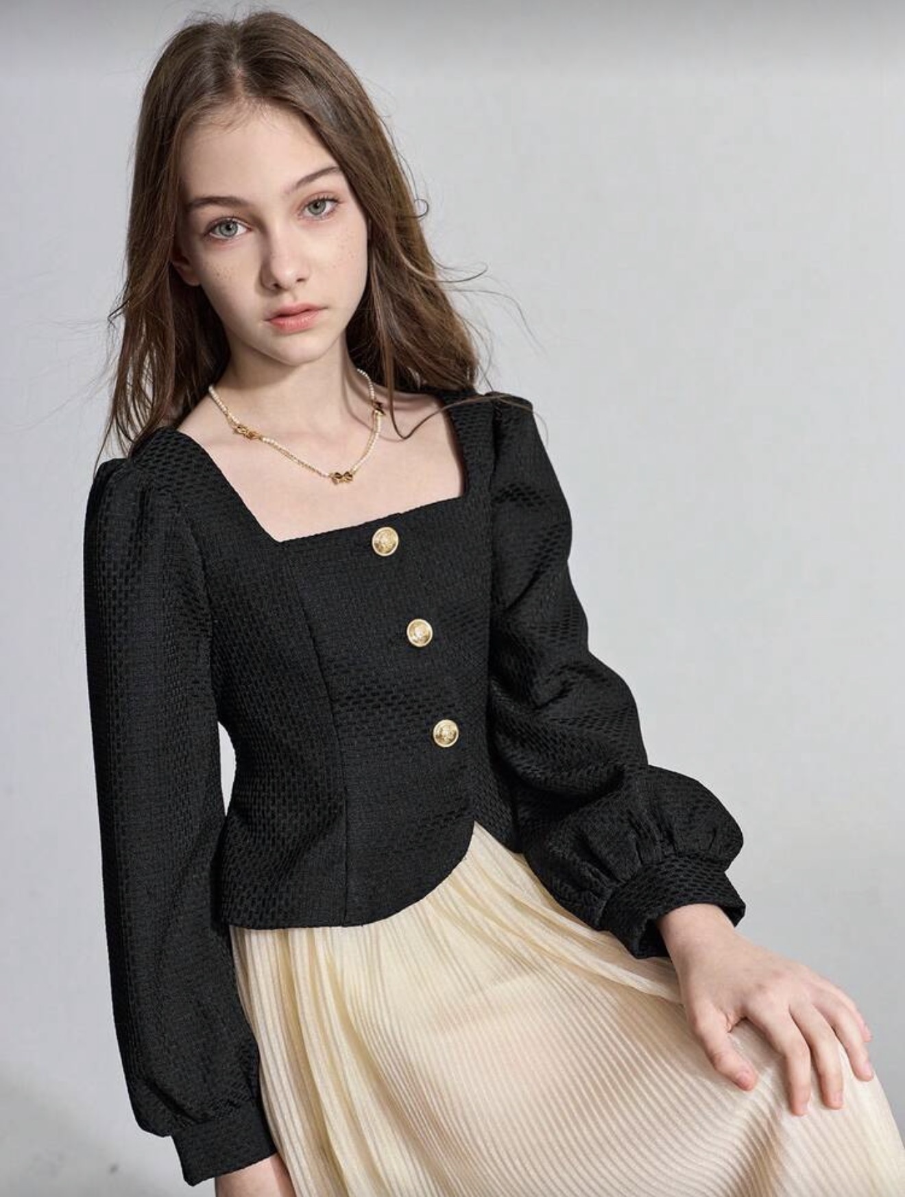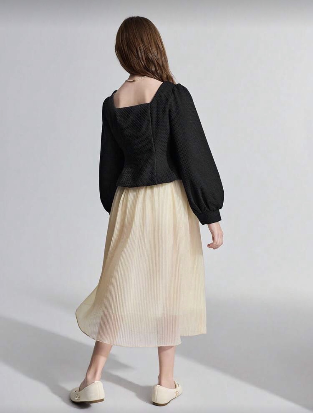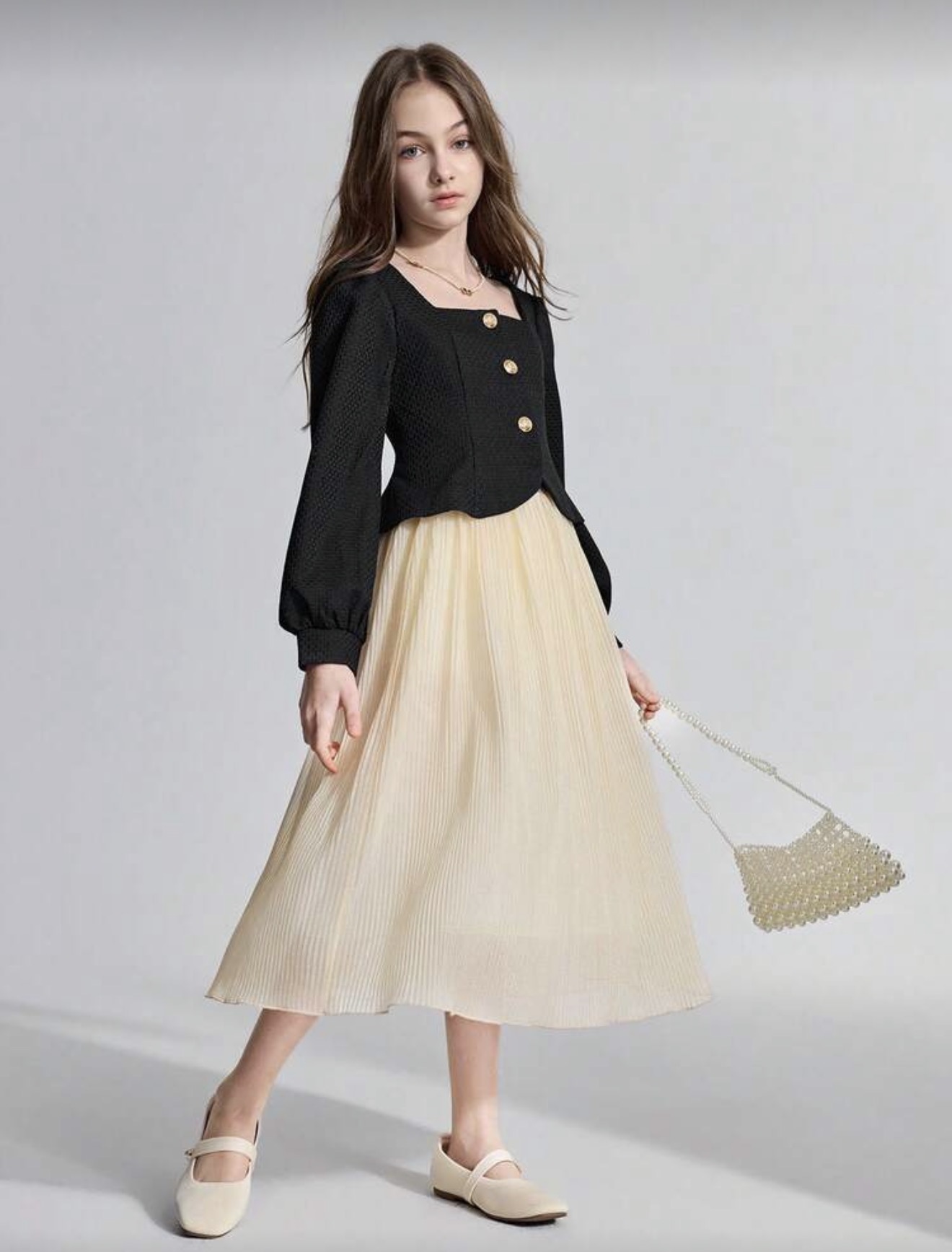 بدلة كاجوال أنيقة مكونة من جاكيت ذو رقبة مربعة سوداء منسوجة وتنورة للفتيات المراهقات