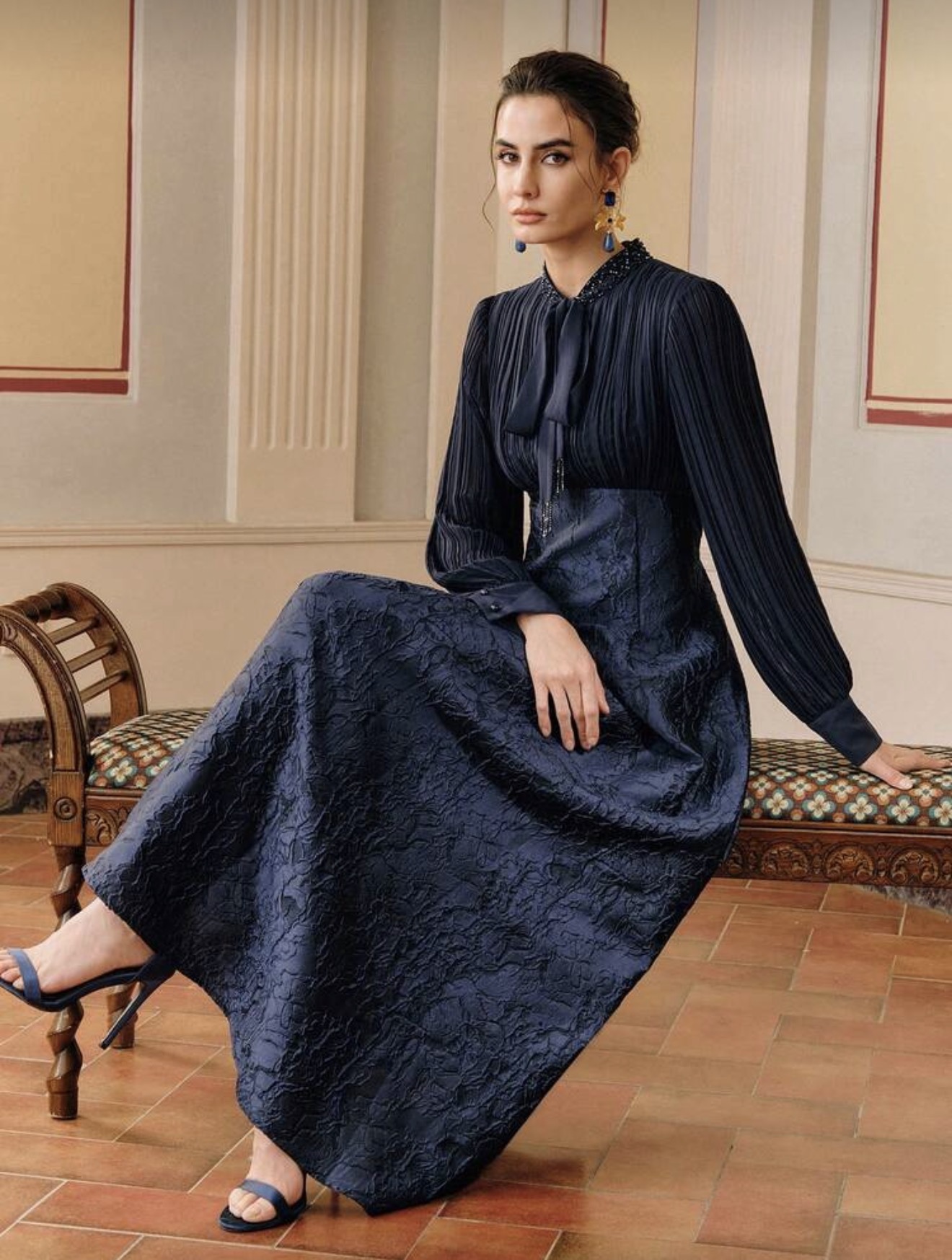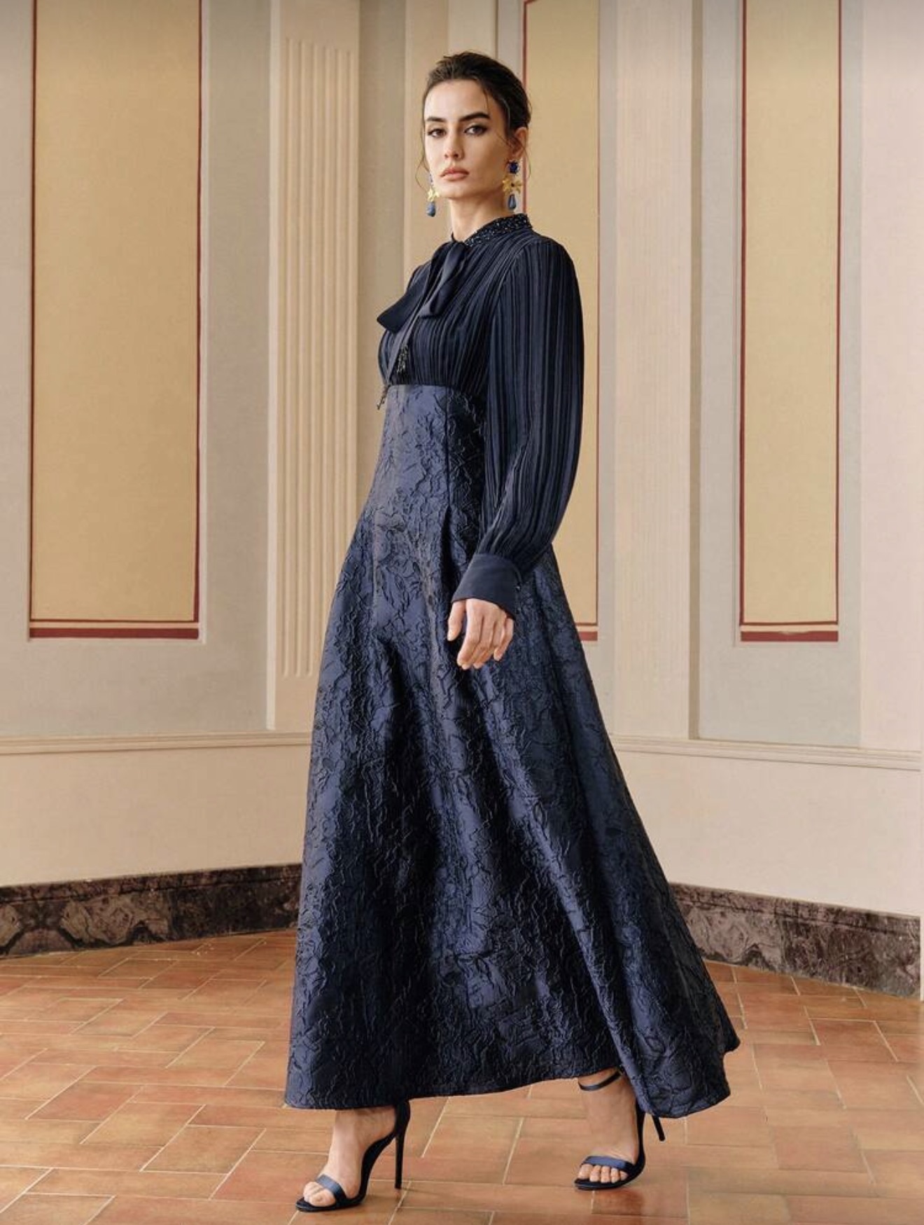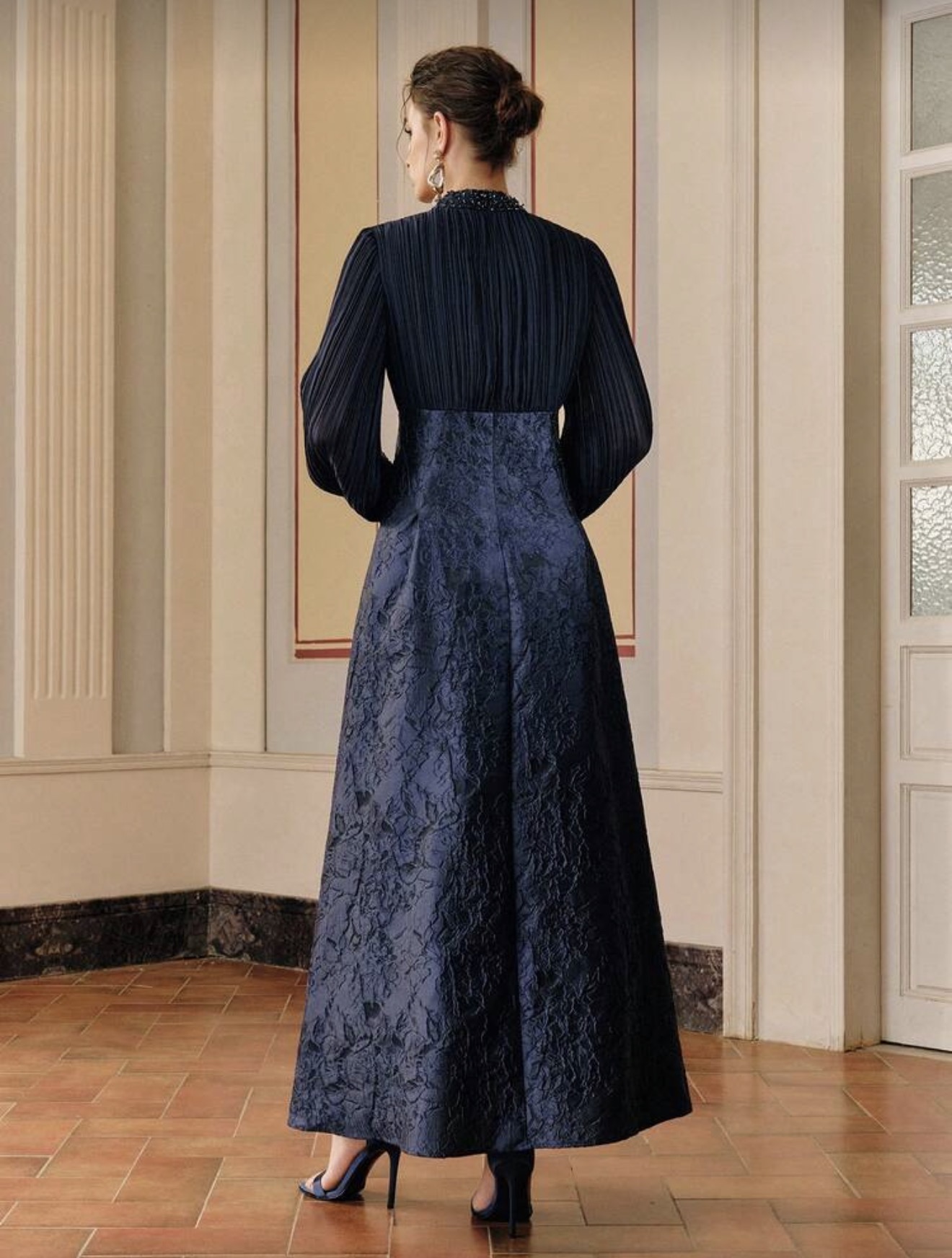 فستان أزرق نافي متوسط الطول مع ياقة ربطة، فستان شيفون جاكار مطرز أنيق بأكمام طويلة للحفلات و للعيد